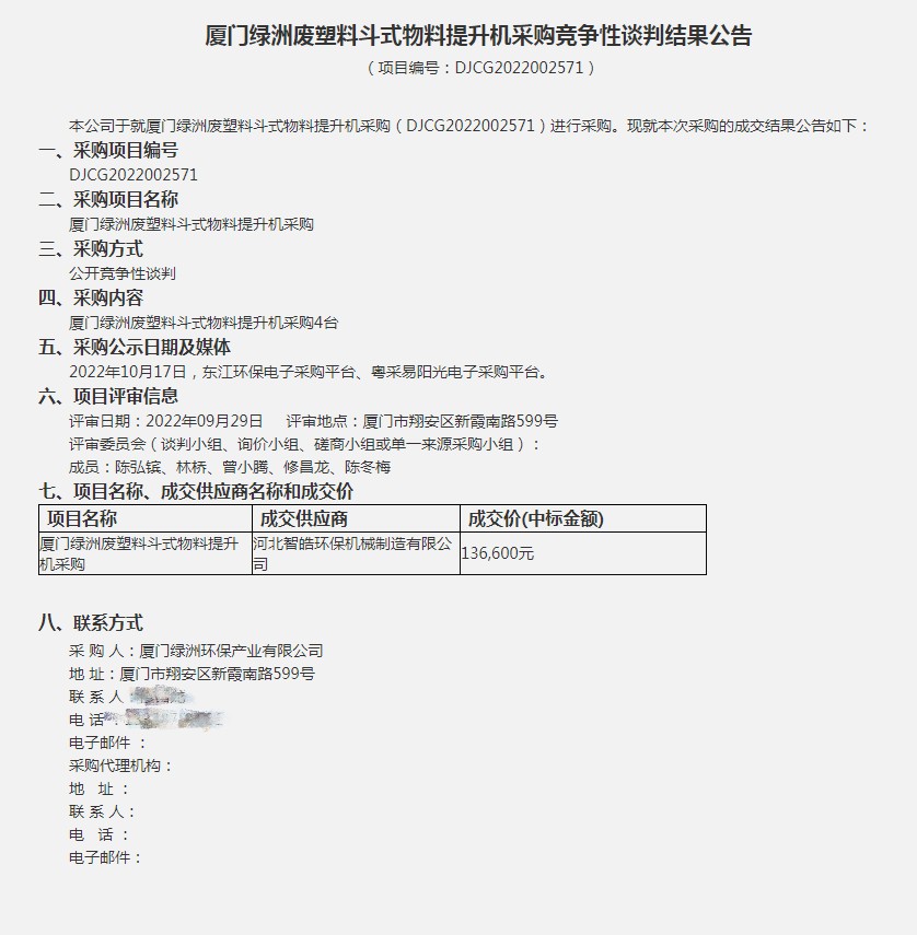 热烈庆祝厦门绿洲废塑料斗式提升机采购项目中标