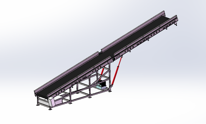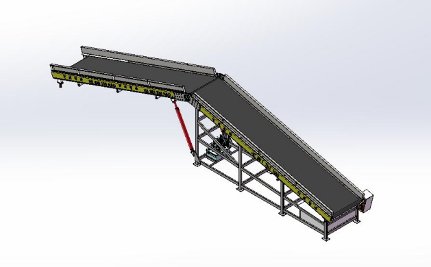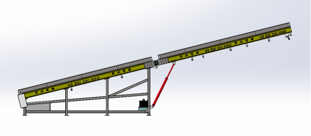 升降皮带输送机包含主动辊装配,支腿,托辊,框架,被动辊装配,上托辊,下托辊及液压缸。主动辊装配由直径 140mm 滚筒,带方形座轴承UELFU210,GSAF67 斜齿轮-蜗轮蜗杆减速机配2.2KW电机及防跑偏装置构成。上托辊由带方形座轴承 UELFU210,防跑偏装置及直径140mm滚筒组成。下托辊由直径 76mm 滚筒组成。被动辊装配由直径140mm滚筒,带滑块座轴承UCK209 及防跑偏装置组成。